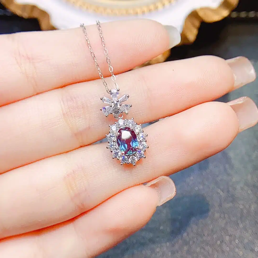 Le collier alexandrite est un bijou d’exception, mêlant élégance et raffinement grâce à sa pierre semi-précieuse d’alexandrite. Taillée en forme ovale, cette pierre unique est connue pour ses reflets fascinants qui varient selon la lumière, passant de teintes vertes à des nuances violettes. Ce jeu de couleurs apporte une touche mystique et captivante, faisant de ce collier bien plus qu’un simple accessoire.