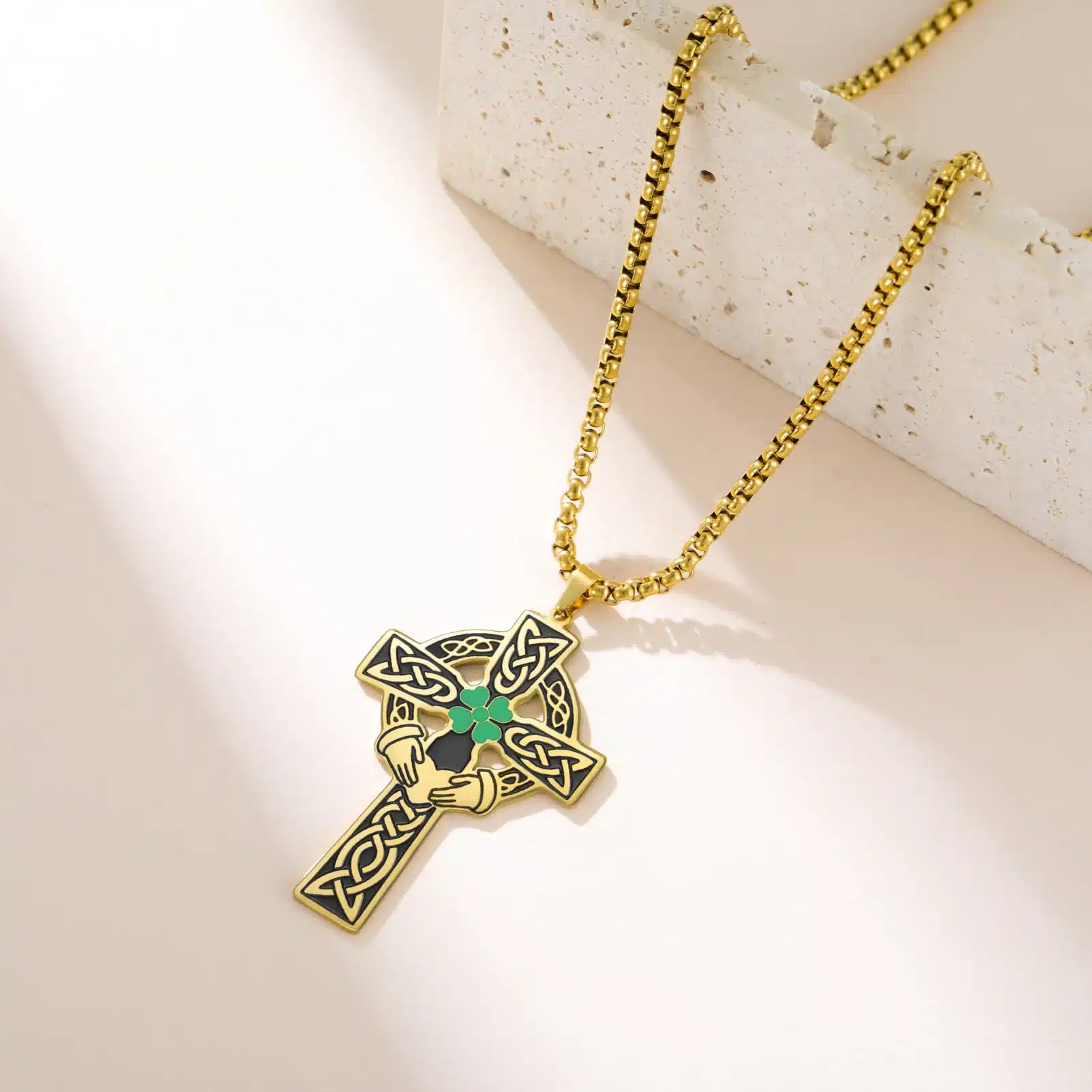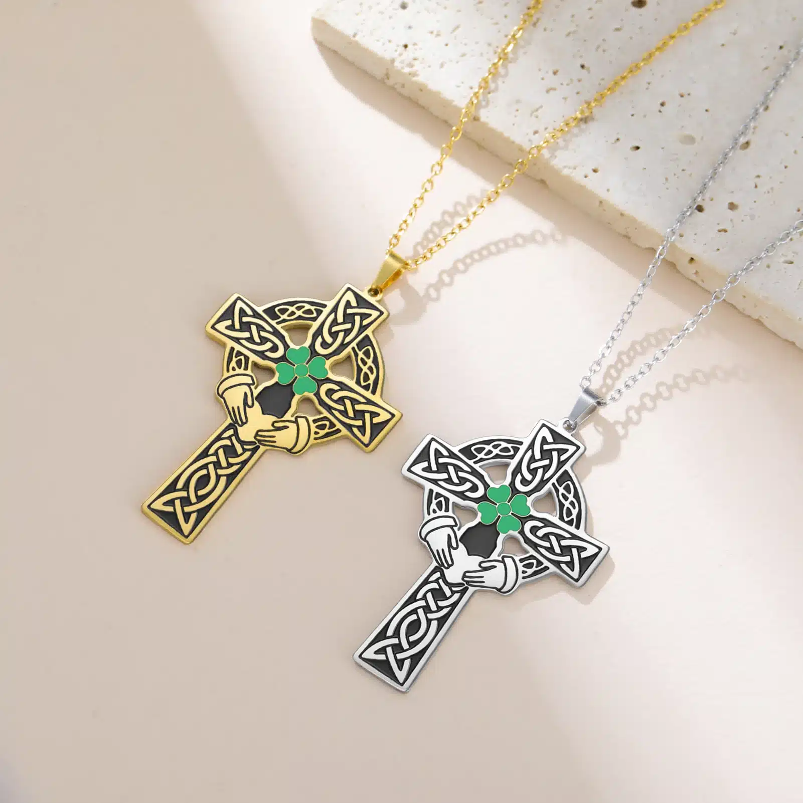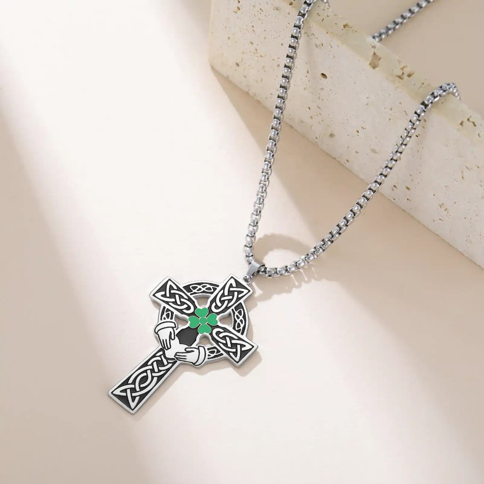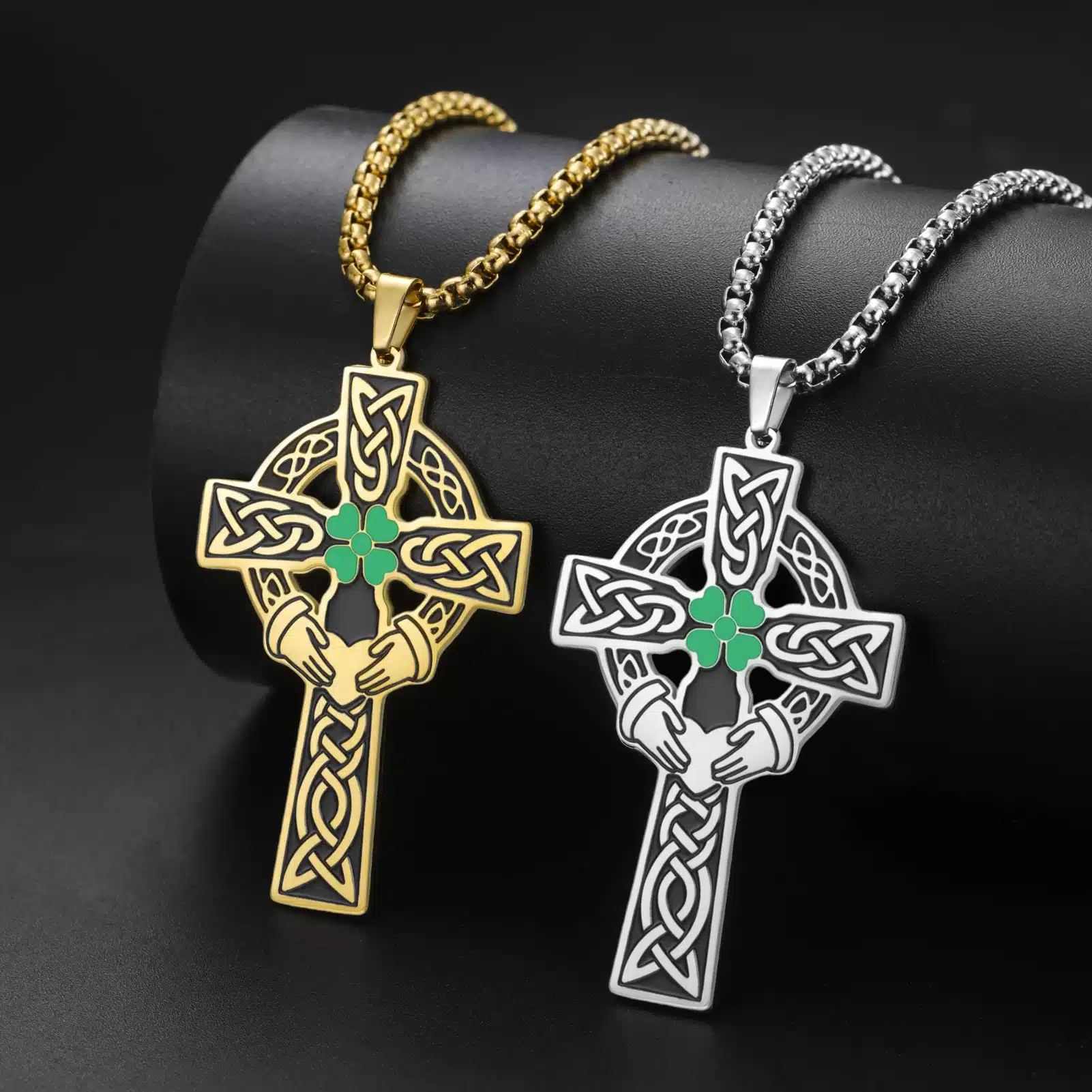 Le pendentif du collier croix celtique associe motifs traditionnels et design affirmé. Chaque branche est décorée de gravures d’entrelacs en relief, mises en valeur par des zones plus sombres qui soulignent les détails. Au centre, un trèfle vert brillant attire l’œil, porté par deux mains stylisées sous un cœur discret, pour une symbolique forte et visuelle. Le cercle partiellement ajouré équilibre l’ensemble et apporte du caractère au bijou. Le dos du pendentif reste lisse pour un port confortable sur la peau.