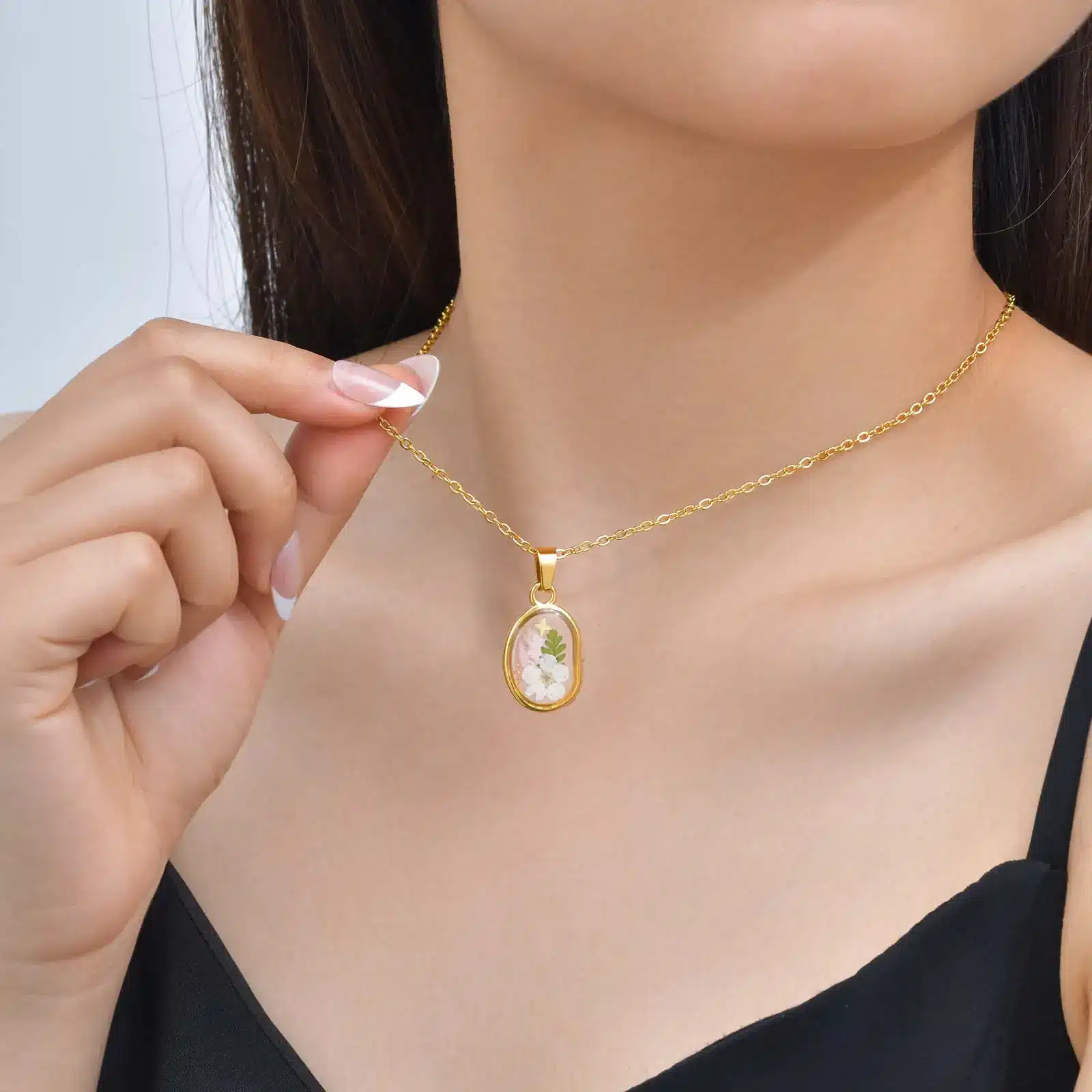 Le pendentif en résine transparente renferme une composition florale délicate qui joue avec la lumière. Chaque détail est visible à travers la surface lisse et brillante, avec un effet verre net et lumineux. Le contraste entre les fleurs colorées et la bordure dorée donne au collier fleur sechees un style doux, élégant et poétique.