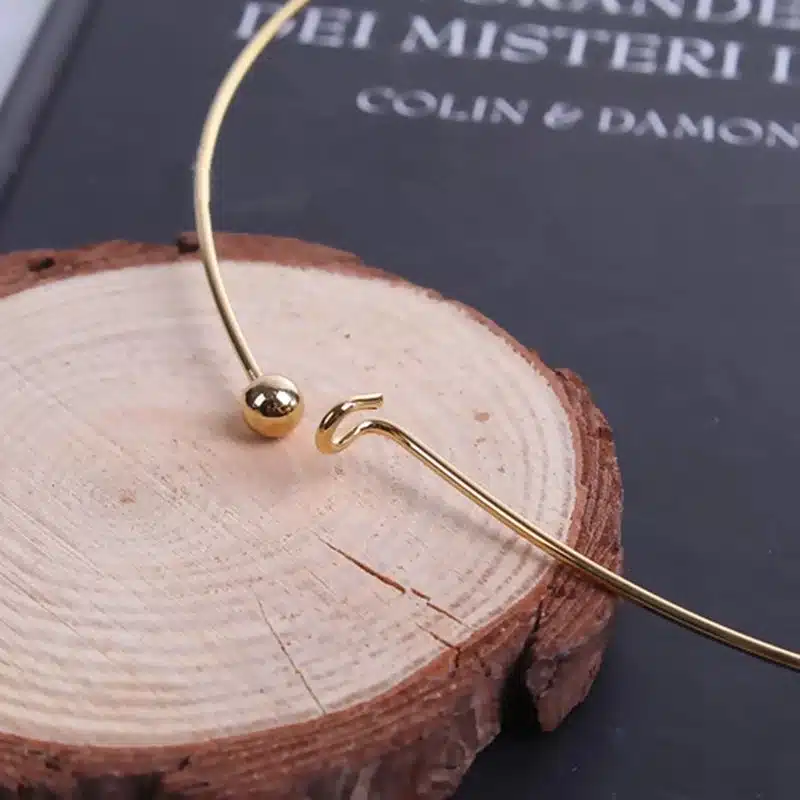 Le cercle rigide doré du collier jonc or crée tout de suite un style propre et moderne, avec une forme minimale qui se pose autour du cou sans effort. La surface lisse et brillante apporte un effet miroir qui illumine la tenue. Le collier garde sa forme, ce qui donne un rendu net du matin au soir.