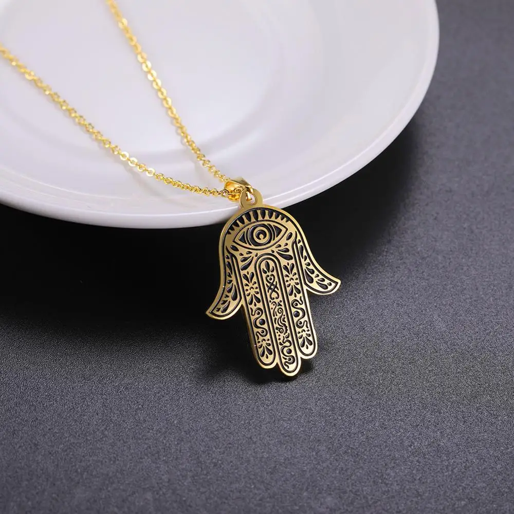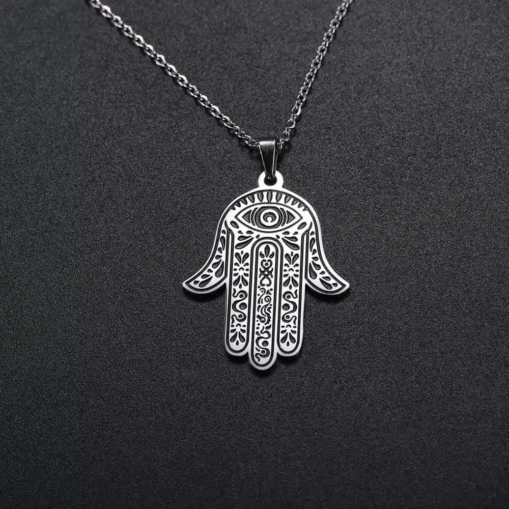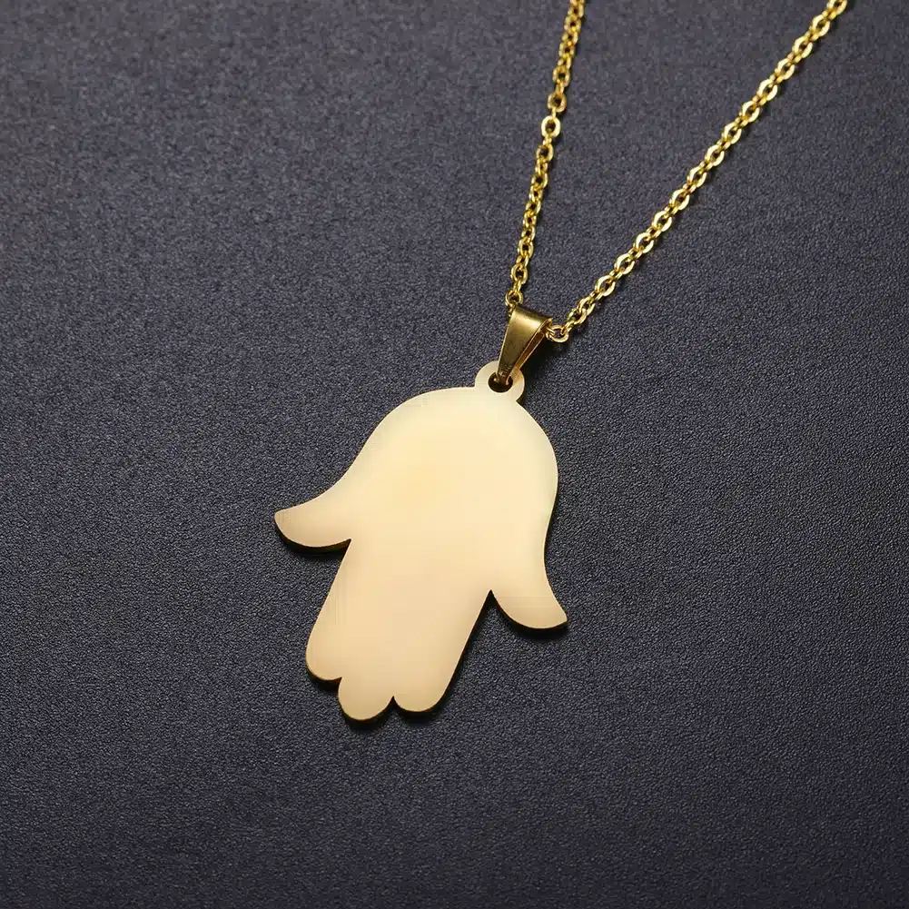 Le collier la main de fatma est fabriqué en acier inoxydable, un matériau résistant à l’eau, hypoallergénique et qui ne noircit pas. La finition dorée est brillante, parfaite pour une tenue claire ou solaire, la version argentée est plus sobre, avec un rendu légèrement patiné qui accentue les reliefs du motif. Le pendentif mesure environ 3,3 cm de haut et reste léger sur la peau tout en gardant une bonne tenue visuelle.