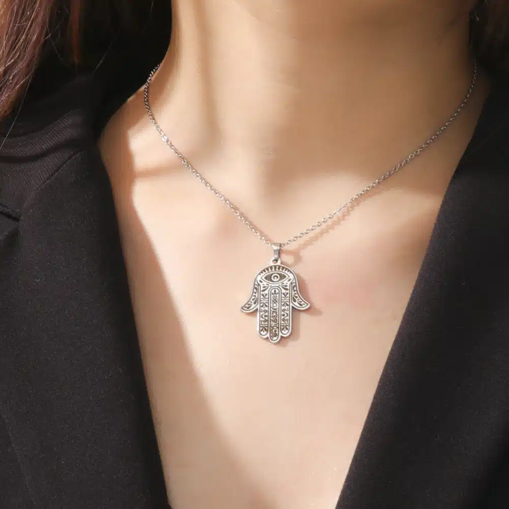 Le collier la main de fatma se porte aussi bien seul qu’en accumulation avec d’autres bijoux. Il convient aux styles bohème, minimaliste ou spirituel, et à toutes celles et ceux qui aiment porter un bijou symbolique avec du sens.
