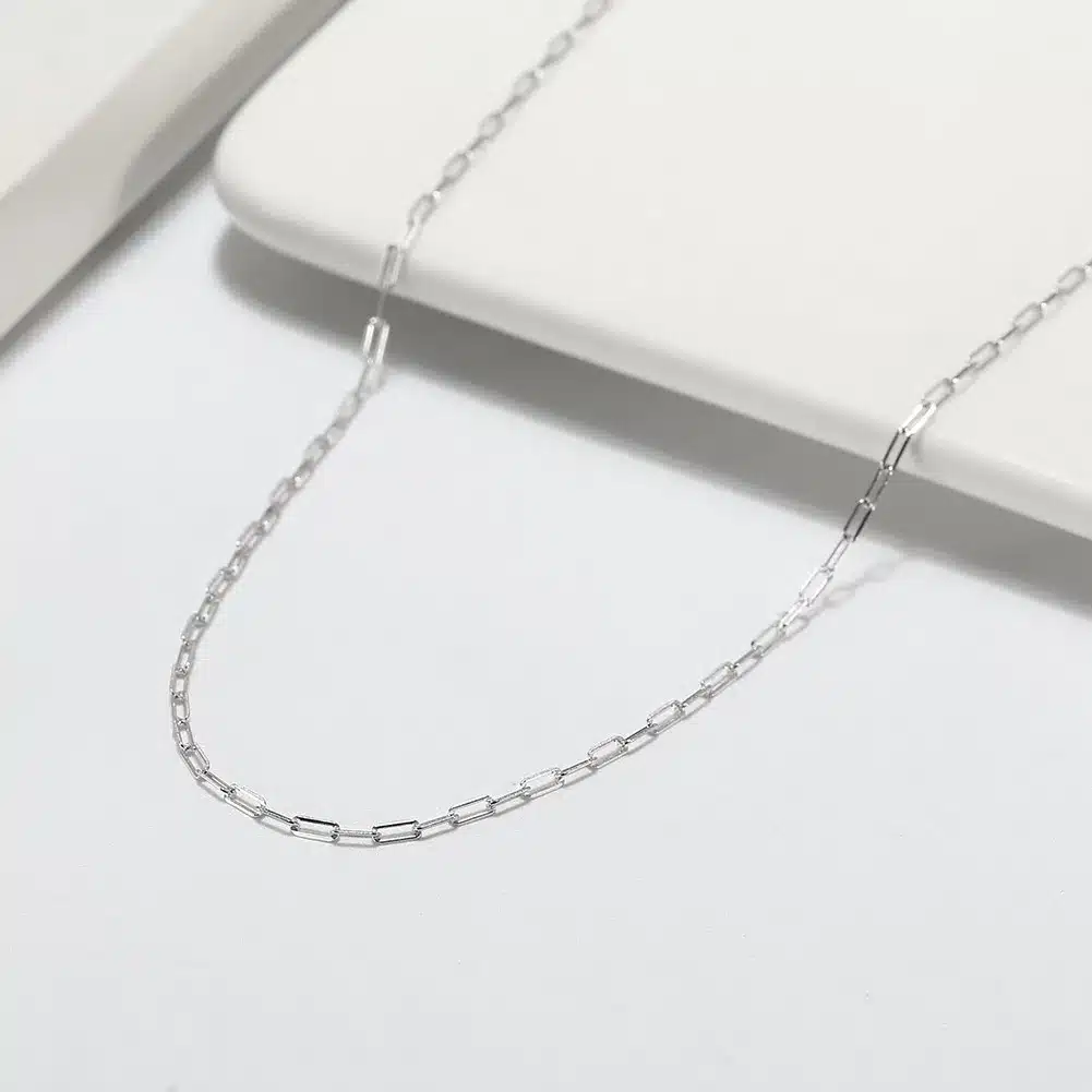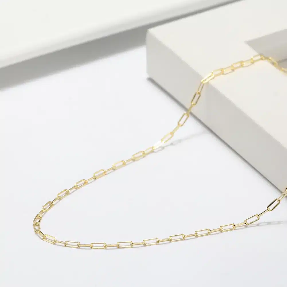 Le chaînage fluide à maillons rectangulaires donne un rendu moderne et sophistiqué. Chaque maillon est poli pour refléter la lumière sous tous les angles, créant un effet brillant et élégant. Disponible en version courte de 45 cm ou en version longue de 55 cm, il s’adapte à toutes les morphologies et à tous les styles. Porté seul, il attire le regard avec discrétion. En layering, il apporte de la structure et du relief à une composition de colliers.
