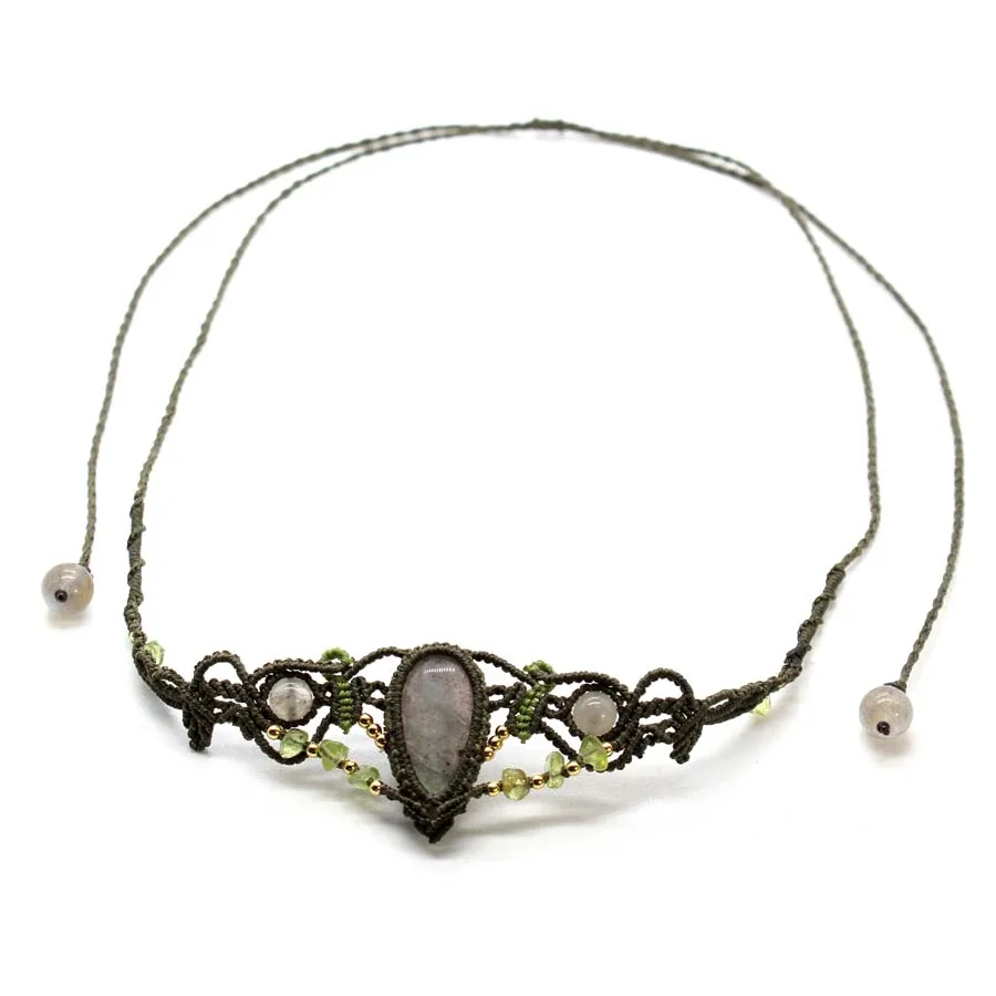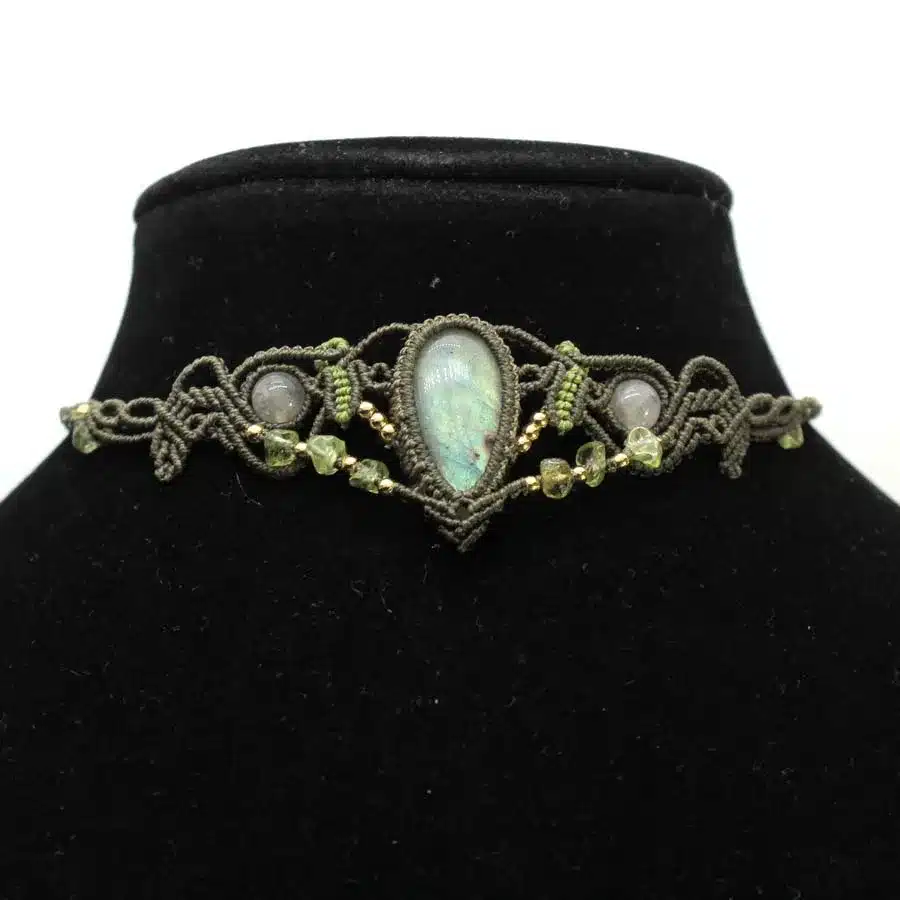 Le tissage minutieux du collier micro macramé attire le regard par ses détails fait à la main et son style elfique unique. Chaque fil est tressé pour créer une pièce raffinée, à la fois naturelle et élégante. Le pendentif central en labradorite diffuse de subtils reflets bleus et verts selon la lumière, apportant une touche mystique et apaisante. Autour, les perles dorées et éclats d’olivine ajoutent de la lumière et du contraste, donnant au bijou un aspect vivant et harmonieux.