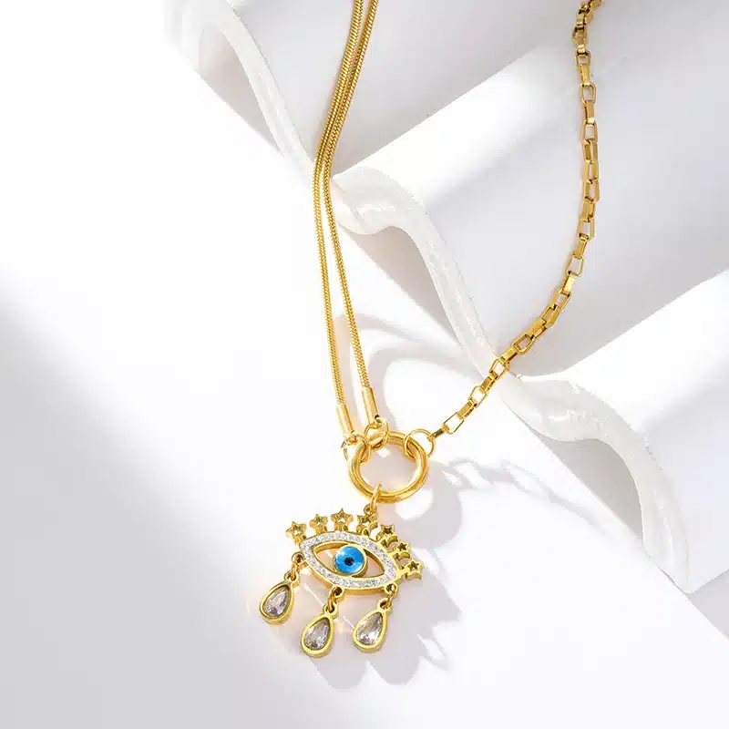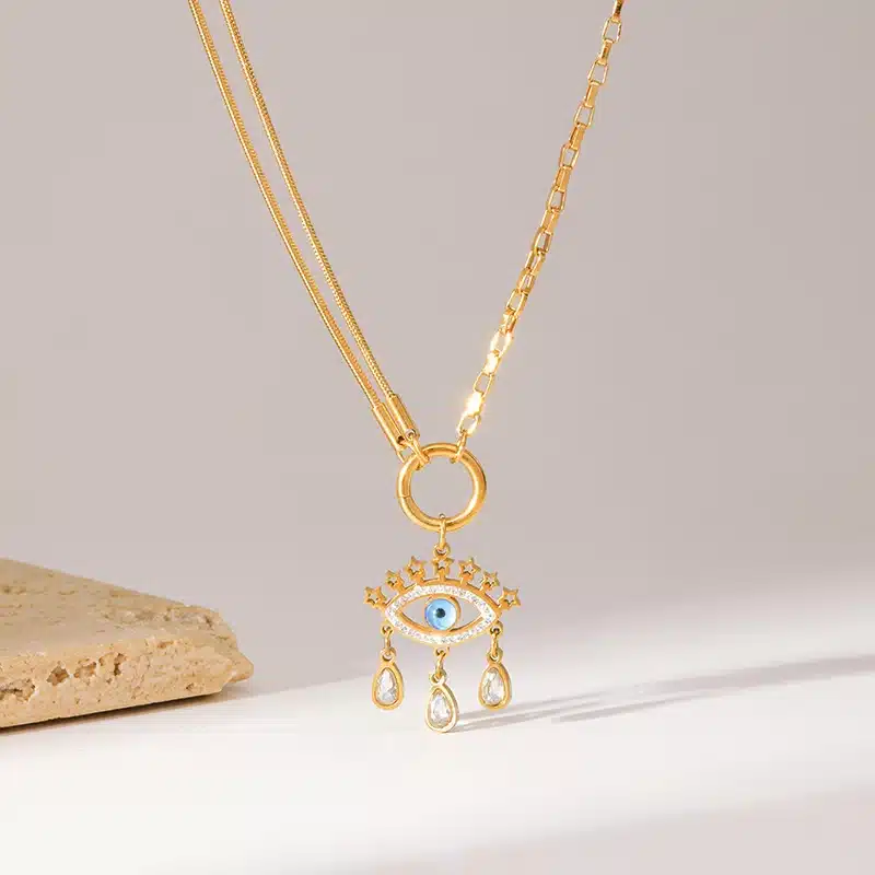 Le collier protection mauvais œil est fabriqué en acier inoxydable doré, un matériau résistant à l’eau et à l’oxydation. Il garde son éclat même porté souvent et reste hypoallergénique pour les peaux sensibles. Les détails du pendentif sont visibles des deux côtés, ce qui assure un rendu soigné sous tous les angles.