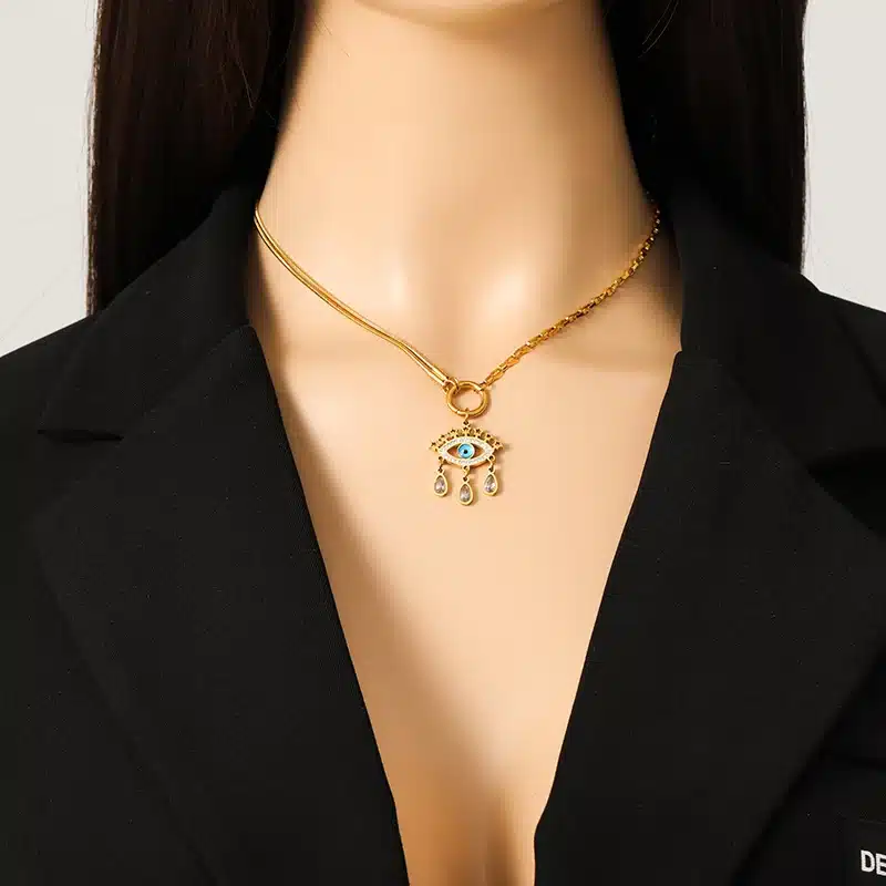 Le pendentif œil stylisé du collier protection mauvais œil capte la lumière avec ses cristaux transparents facettés et son iris bleu éclatant, entouré d’un métal doré lumineux. Trois gouttes suspendues en pendentif ajoutent du mouvement et donnent à ce bijou une allure précieuse sans être trop chargée. Le motif est travaillé en détail, avec un dos lisse et confortable, agréable à porter sur la peau.